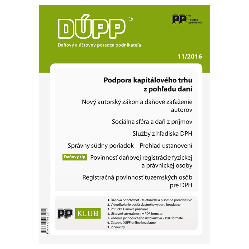 Publikácia obsahuje nasledovné témy: Podpora kapitálového trhu z pohľadu daní, Povinnosť daňovej registrácie fyzickej a právnickej osoby, Registračná povinnosť tuzemských osôb pre DPH, Nový autorský zákon a daňové zaťaženie autorov, Sociálna sféra a daň z príjmov + TEST, Zostatková cena hmotného...