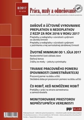 Publikácia obsahuje nasledovné témy: Daňové a účtovné vyrovnanie preplatkov a nedoplatkov z RZZP za rok 2016 v roku 2017, Životné minimum od 1. júla 2017, Trvanie pracovného pomeru (povinnosti zamestnávateľa), Monitorovanie priestorov neprístupných verejnosti,...