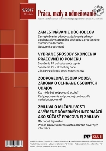 Publikácia obsahuje nasledovné témy: Zvýšenie životného minima - vplyv na oblasť zdaňovania príjmov v číslach, Zamestnávanie dôchodcov, Vybrané spôsoby skončenia pracovného pomeru, Zodpovedná osoba podľa zákona o ochrane osobných údajov verzus Nariadenie Európskeho parlamentu a Rady (EÚ) 2016/679, Zmluva o mlčanlivosti a výmene dôverných informácií ako súčasť pracovnej zmluvy, Zásady podávania, preverovania a evidovania podnetov podľa § 11 ods. 8 zákona č. 307/2014 Z. z. - vnútorný predpis,...