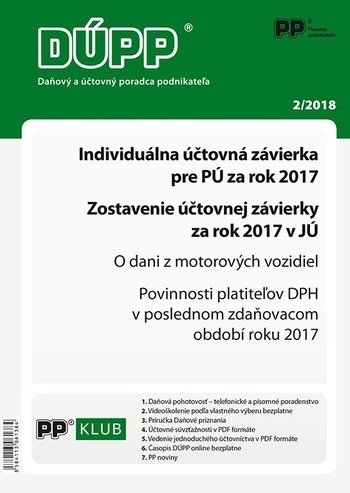 Publikácia obsahuje nasledovné témy: Individuálna účtovná závierka podnikateľov účtujúcich v sústave podvojného účtovníctva za rok 2017, Zostavenie účtovnej závierky za rok 2017 v jednoduchom účtovníctve, O dani z motorových vozidiel, Povinnosti platiteľov DPH v poslednom zdaňovacom období roku...