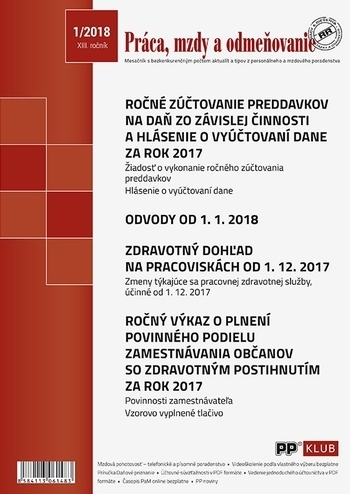 Publikácia obsahuje nasledovné témy: Ročné zúčtovanie preddavkov na daň zo závislej činnosti a hlásenie o vyúčtovaní dane za rok 2017, Odvody od 1. 1. 2018, Zdravotný dohľad na pracoviskách od 1. 12. 2017, Ročný výkaz o plnení povinného podielu zamestnávania občanov so zdravotným postihnutím za rok 2017, Prieskum spokojnosti zamestnancov,...
