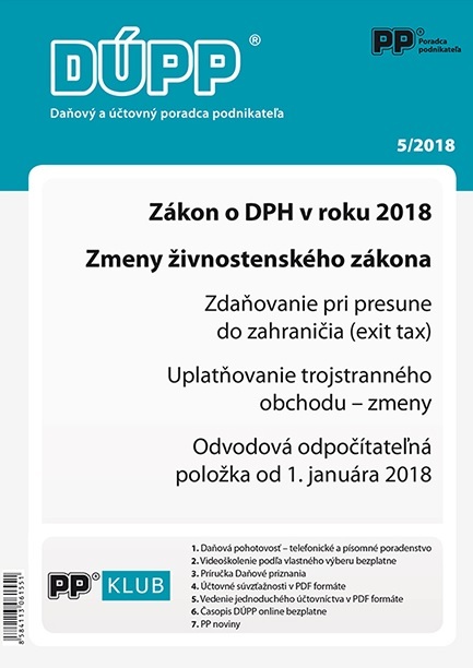 Publikácia obsahuje nasledovné témy: Zákon o DPH v roku 2018, Aktuálne zmeny živnostenského zákona, Zdaňovanie peňažných a nepeňažných plnení v oblasti zdravotníctva, Zdaňovanie pri presune do zahraničia (exit tax) od roku 2018, Zmeny v uplatňovaní trojstranného obchodu od 1. 1. 2018,...