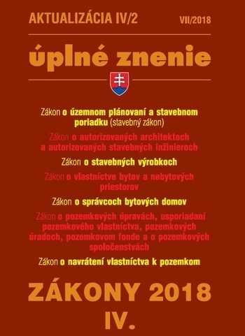 Aktualizácia obsahuje tieto novelizované zákony: Zákon č. 50/1976 Zb. o územnom plánovaní a stavebnom poriadku (stavebný zákon) po novele zákonom č. 177/2018 Z. z. s úč. 1.1.2019, Zákon č. 138/1992 Zb. o autorizovaných architektoch a autorizovaných stavebných inžinieroch po novele zákonom č. 177/2018 Z. z. s úč. 1.1.2019, Zákon č. 133/2013 Z. z. o stavebných výrobkoch po novele zákonom č. 177/2018 Z. z. s úč. 1.1.2019, Zákon č. 182/1993 Zb. o vlastníctve bytov a nebytových priestorov po novele zákonom č. 177/2018 Z. z. s úč. 1.9.2018 a 1.1.2019, Zákon č. 246/2015 Z. z. o správcoch bytových domov po novele zákonom č. 177/2018 Z. z. s úč. 1.1.2019, Zákon č. 330/1991 Z. z. o pozemkových úpravách, usporiadaní pozemkového vlastníctva, pozemkových úradoch, pozemkovom fonde a o pozemkových spoločenstvách po novele zákonom č. 177/2018 Z. z. s úč. 1.1.2019, Zákon č. 503/2003 Z. z. o navrátení vlastníctva k pozemkom a o zmene a doplnení zákona NR SR č. 180/1995 Z. z. o niektorých opatreniach na usporiadanie vlastníctva k pozemkom v znení neskorších predpisov po novele zákonom č. 177/2018 Z. z. s úč. 1.1.2019