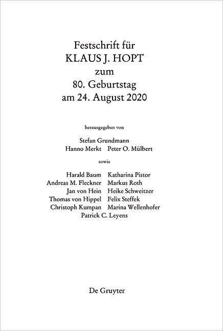 Festschrift für Klaus J. Hopt zum 80. Geburtstag am 24. August 2020