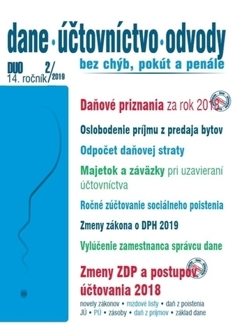 Publikácia obsahuje: Daňové priznania za rok 2018 + otázky z praxe, Zemny v zákone o dani z príjmov a v účtovných postupoch v roku 2018, Podmienky pre oslobodenia príjmu z predaja bytov od dane, Odpočet daňovej straty PO, Bezodplatné plnenia a plnenia uskutočnené na iný účel ako podnikanie v systéme DPH, Zmeny zákona o DPH v roku 2019, Oceňovanie majetku a záväzkov pri uzavieraní účtovných kníh, Triedenie účtovných jednotiek, Osobná spotreba podnikateľa v JÚ, Osobné platenie preddavkov na daňovú povinnosť FO, Vylúčenie zamestnanca správcu dane v daňovom konaní, Odpočítanie DPH pri vyvolanej investícii, Poukazy z pohľadu zákona o DPH v roku 2019, Vylúčenie zamestnanca správcu dane v daňovom konaní, Daňové zvýhodnenie na vyživované deti a zaplatené úroky pri úveroch na bývanie, .