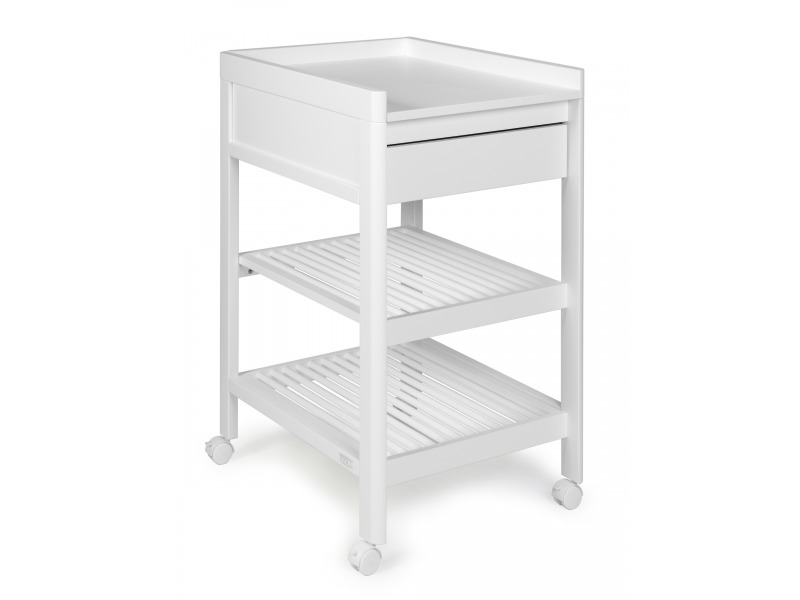 Dřevěný přebalovací pult na kolečkách z kolekce nábytku Troll Lukáš. kolečka pro snadný přesun zásuvka dvě úložné police Barva: bílá Materiál: bříza Rozměry: 560 (hloubka) x 720 (šířka) x 970 mm (výška)