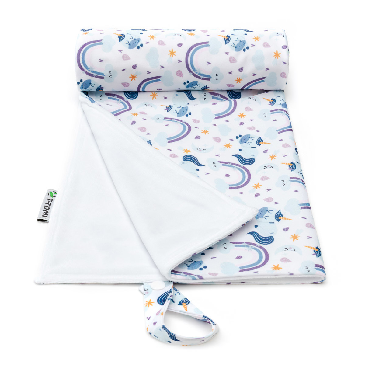 100% polyester s PUL zátěrem dotyková vrstva - kojenecký plyš rozměr 50 x 70 cm praktické ucho s patentkou všestranné využití moderní design