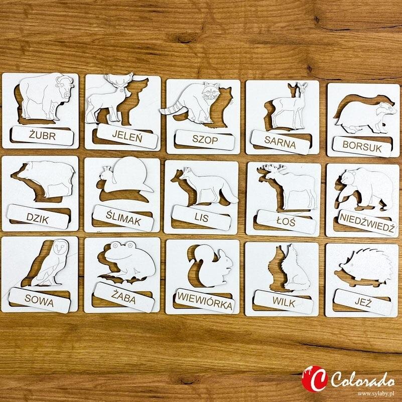 Zawiera 45 elementów (15 tabliczek z wyciętymi kształtami, 15 kształtów, 15 nazw kształtów).