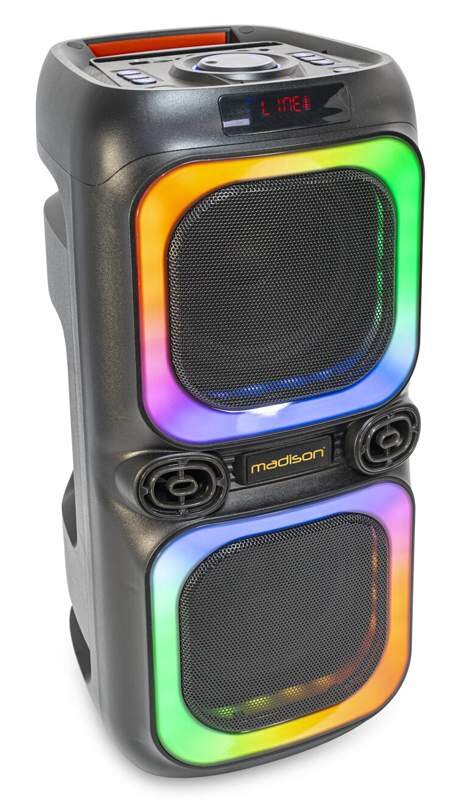 Představujeme vám přenosný bateriový systém s barevným LED osvětlením reproduktorů, které můžete podle své nálady snadno zapnout nebo vypnout. Tento výkonný systém nabízí skvělý zvukový zážitek a je vybaven dvěma 8" basovými reproduktory a dvěma výškovými reproduktory pro věrnou reprodukci hudby ve vysoké kvalitě.