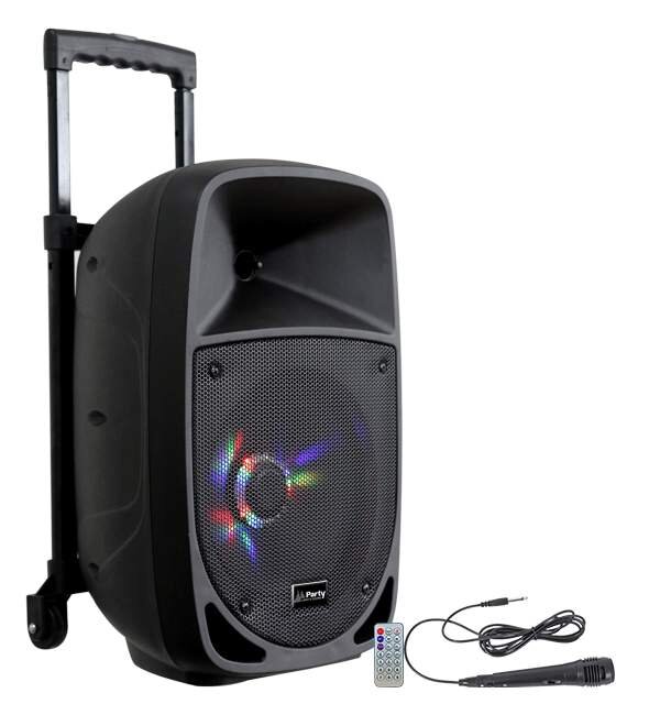 10" přenosný párty bateriový systém s LED osvětlením reproduktoru. Obsahuje vestavěný 4,4Ah akumulátor s výdrží cca 4 hod. Obsahuje 1x ruční kabelový mikrofon, 1x MIC vstup (Jack6,3), 1x AUX vstup (jack3,5). Má vestavěný FM tuner a MP3 přehrávač s USB konektorem, slotem pro SD kartu, LED displejem a blueTooth připojením. Umožňuje přehrávání skladeb přes bluetooth například z mobilního telefonu. Systém má možnost napájení z vestavěného akumulátoru nebo ze sítě 230V / 50Hz. Systém je vhodný pro domácí a zahradní párty , školky, školy. Není vhodný na komerční a profesionální použití. Soustava má vestavěnou výsuvnou rukojeť a kolečka pro snadnější transport.