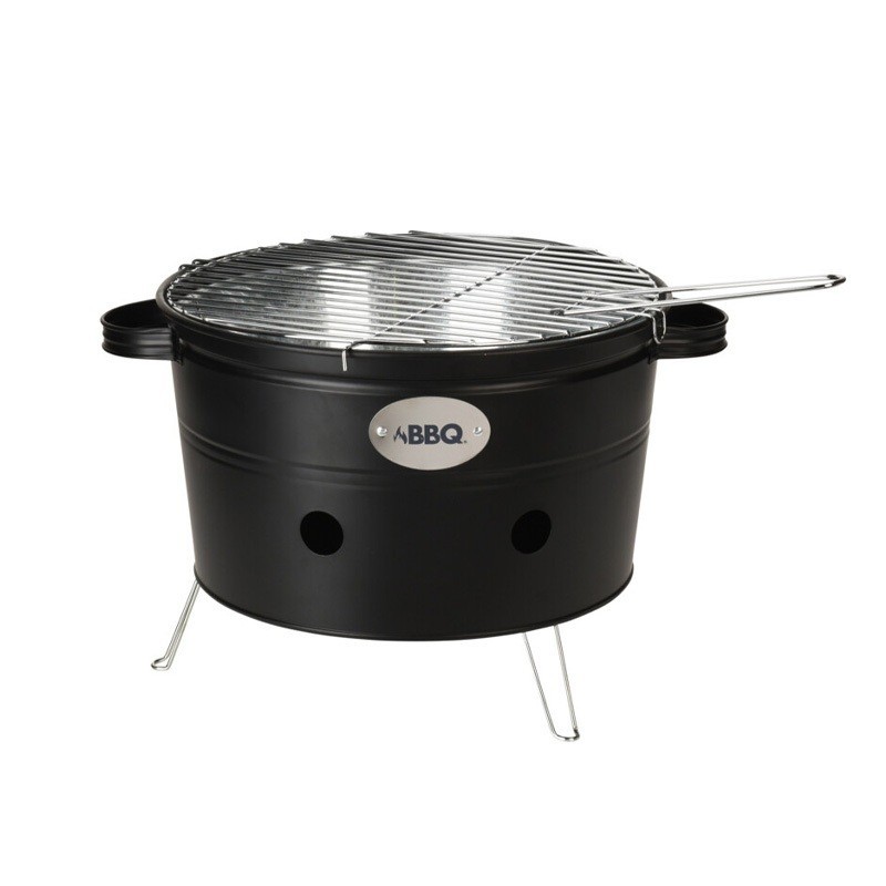 kbelík na grilování, matná černá barva, průměr dna 300 mm, průměr horní části 345xh200 mm, se 2 držadly, tloušťka 0,3 mm, vnitřní kbelík průměr dna 250 mm, průměr horní části 330xh100 mm, tloušťka 0,5 mm, pozinkovaný grilovací stojan, chromovaný, průměr 35 mm (3,0/2,0 mm), s kovovým logem bbq