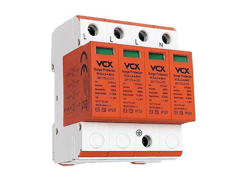 Technicky vyspělá modulární přepěťová ochrana VCX-L2-B+C 12.5 kA třídy T1 T2 určená k ochraně napájecích instalací NN proti indukovaným a spínacím přepětím.