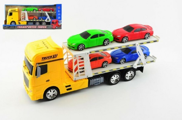 Auto přepravník + 4 auta plast 45cm na setrvačník asst 3 barvy v krabici