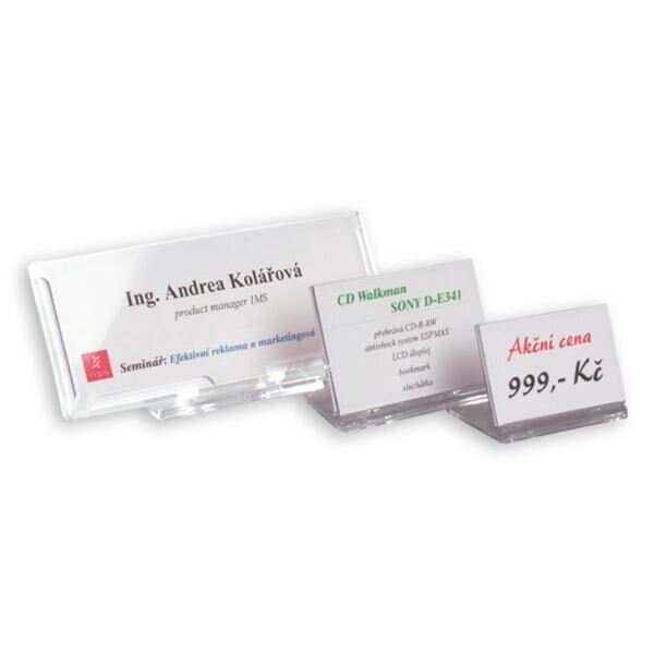 stolní identifikátor z průhledného pevného plastu se skládacím podstavcem ;uvnitř s čistou papírovou předlohou, na kterou stačí pouze dopsat potřebné informace ;lze využít jako nositel textů, popisků, nápisů, cenovek apod. ;rozměr: 200x80 mm ;balení 12 ks číst celé
