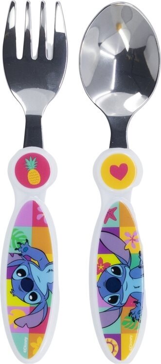Tato sada obsahuje dvě nezbytné části - lžičku a vidličku - navržené s ohledem na malou dětskou ručičku. Díky zaoblenému tvaru a bezpečnému provedení se děti učí správnému zacházení s příborem, aniž by riskovaly poranění. Navíc originální motiv Stitche z oblíbeného filmového světa přitahuje pozornost a dělá z jídla zábavný zážitek, který děti baví opakovat.