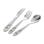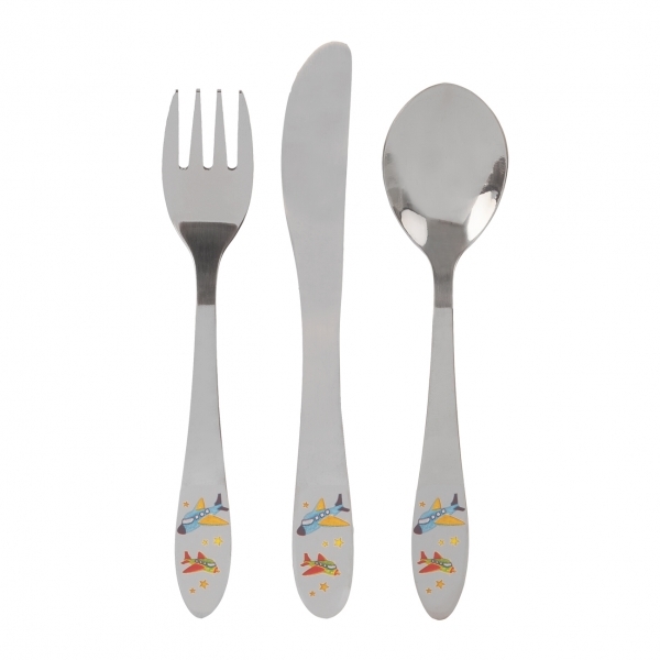 Dětský příbor s barevným dekorem letadel pro kluky. Obsahuje 3 ks - lžíci, vidličku a nůž. Materiál: kvalitní nerez. Tvar přizpůsobený dětem. Lze mýt v myčce na nádobí, ale nedoporučujeme, mohlo by dojít k porušení barevného dekoru, což později nemůže být důvodem reklamace. Rozměry: (délka/šířka) lžíce 15,5/3,5 cm, vidlička 15,5/2,5 cm, nůž 17/2 cm.
