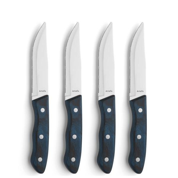 Steakové nože HERCULE 4 ks značky Amefa jsou opatřeny zoubky pro snadné krájení masa, jsou tak vhodné i jako příborový nůž na krájení zeleniny. Netupí se díky kvalitnímu materiálu z nerez oceli. Praktická rukojeť z černého dřeva s masivními nýty přispěje k bezpečné manipulaci. Nože jsou uložené v dřevěné kazetě.