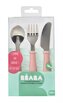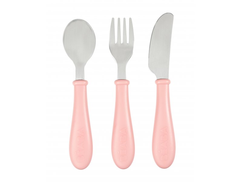 3-dílná sada příboru z kvalitní nerezové oceli s plastovou rukojetí usnadní dítěti přechod od krmení lžičkou k používání příboru. Nerezová vidlička, nůž a lžička jsou lehké a díky ergonomickému plastovému držadlu snadno uchopitelné dětskýma rukama. Prohnutý tvar držadla navíc zabraňuje kontaktu jídla se stolem při položení příboru na stůl.