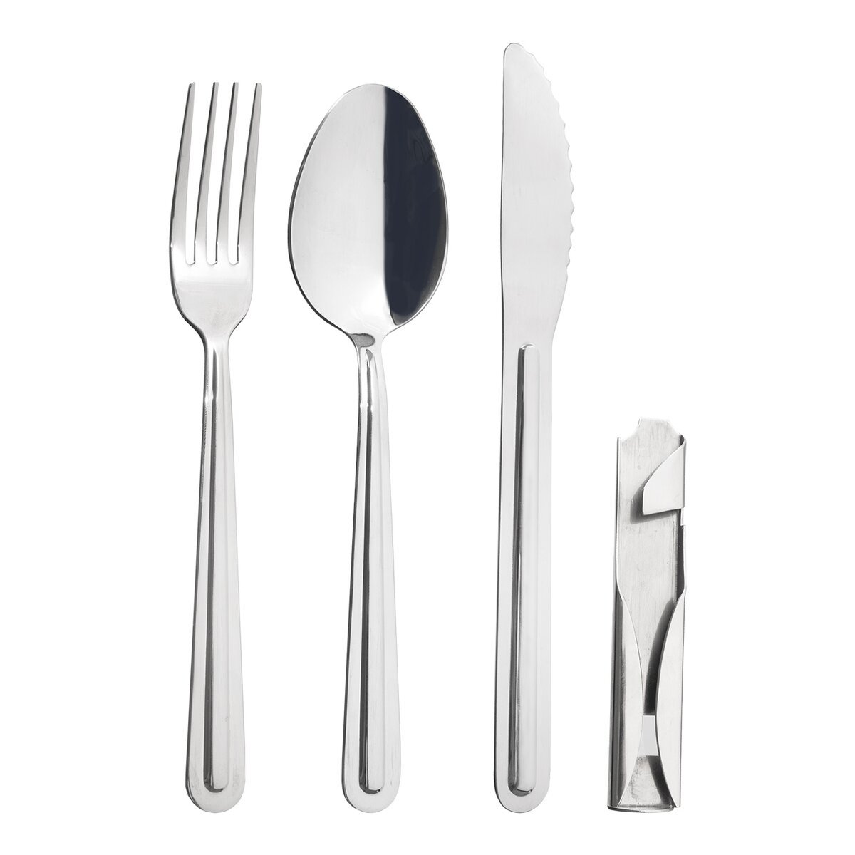 Příbor na cesty oceníte při kempování, táboření, cestování. Lžíci, vidličku a nůž lze prakticky uložit do otvíráku na konzervy. Sada 4 ks. Materiál: nerezová ocel. Příbory lze mýt v myčce na nádobí, ale pokud chcete zachovat neporušený povrch, pak to vzhledem k působení čisticích prostředků nedoporučujeme. Rozměry: lžíce d. 17,5 cm, vidlička d. 17,5 cm, nůž d. 19,5 cm, otvírák d. 10,2 cm.