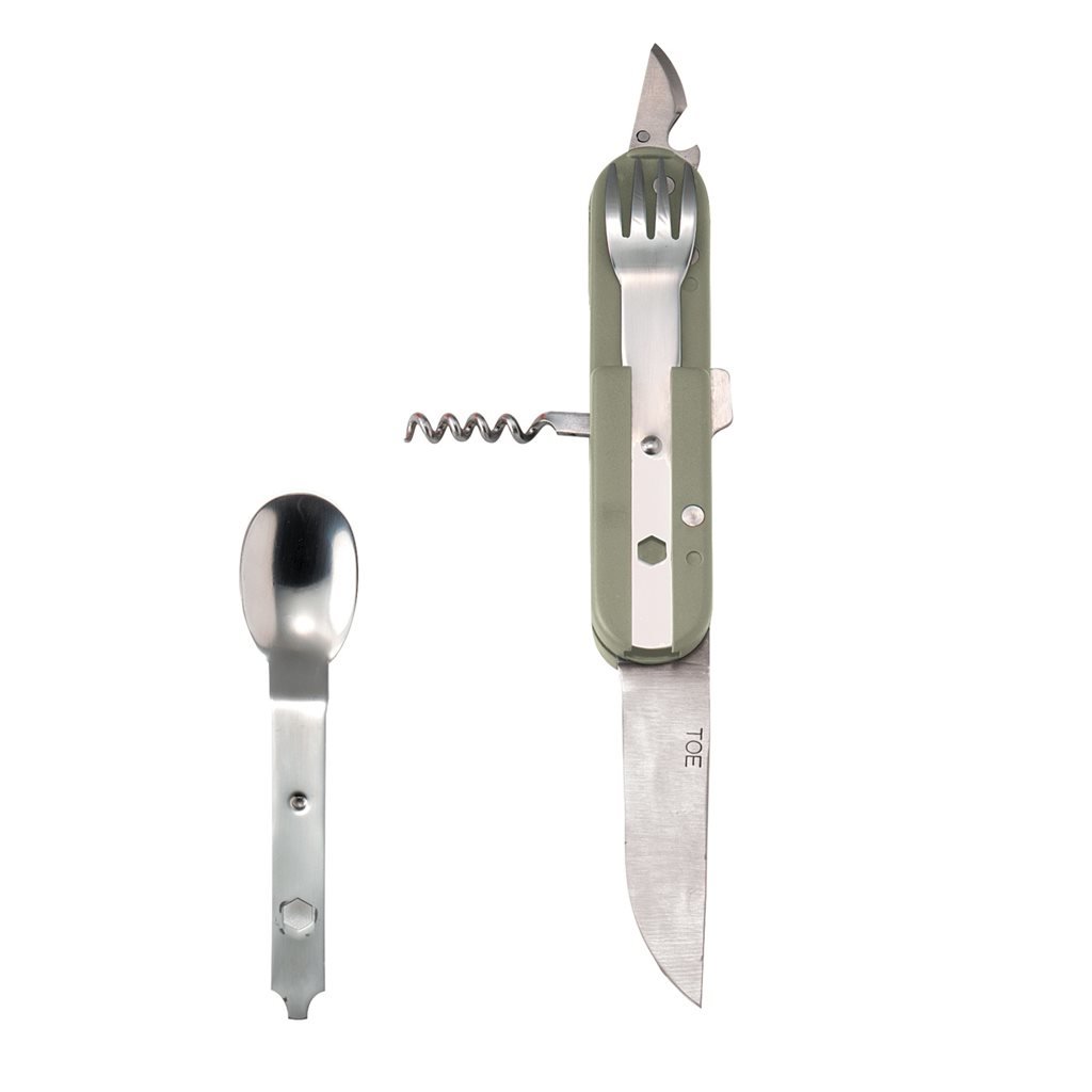 Nástroj obsahuje: nůž, vidličku, lžíci, vývrtku a otvírák na konzervy. Včetně pouzdra, které lze navléknout na opasek.
