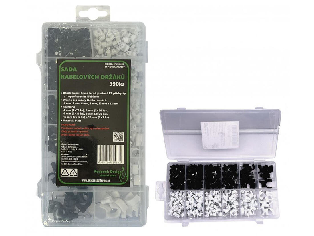 (BAL:1/12ks) SADA KABELOVÝCH DRŽÁKŮ 390 ks. Obsah balení: bílé a černé plastové PP příchytky s 1 upevňovacím hřebíkem. Určeno pro kabely těchto rozměrů: 4 mm, 5 mm, 6 mm, 8 mm, 10 mm a 12 mm. Rozměry: 4 mm (2 × 70 ks), 5 mm (2 × 50 ks), 6 mm (2 × 36 ks), 8 mm (2 × 20 ks), 10 mm (2 × 12 ks) a 12 mm (2 × 7 ks) Materiál: Plast.Balení: transparentní krabička.