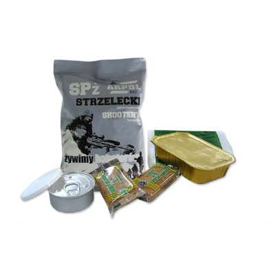 střelecká potravinová dávka ARPOL Vojenská potravinová dávka, MRE, bojová dávka potravin BDP. Existují různé názvy pro obdobný výrobek - balíček s trvanlivými potravinami, které se snadno připravují. Tento balíček vyrábí polská firma ARPOL a kromě jiných ho dodává také do polské armády. Oproti českému BDP má potravinový balíček MRE ARPOL jednoznačně lepší chuť hlavních jídel, která nejsou tolik nasolená. Podobně jako americké MRE obsahuje tato vojenská dávka bezplamenný ohřívač. Co se týče porovnání s americkým Meal Ready to Eat je hlavní výhodou potravinového balíčku ARPOL SPZ přísná kontrola zdravotní nezávadnosti výrobku. Balíčky jsou čerstvé, s dostatečně dlouhou dobou spotřeby, zatímco americké MRE mají obvykle neznámé datum spotřeby. hlavní znaky obsah: hlavní chod, polévka, dezert, doplňky hmotnost hlavního chodu: 300 g hmotnost celého balení: Set 1: 870 g Set 2: 950 g Set 3: 970 g Set 4: 920 g vyrobeno podle norem EU vyhovuje vojenským standardům NATO OBSAH bezplamenný ohřívač voda v pytlku pro bezplamenný ohřívač (velmi šikovné, protože do ohřívače nalejete přesně tolik vody, kolik je potřeba) ohřívač je americké výroby a funguje na principu chemické reakce hlavní chod speciální tvrdé suchary 90 g dezerty: Set 1: turistická paštika 100 g, ovocná cereální tyčinka s brusinkami 40 g Set 2: slazené kondenzované mléko 100 g, hořká čokoláda 50 g Set 3: slazené kondenzované mléko 100 g, ovocná cereální tyčinka s brusinkami 40 g Set 4: slazené kondenzované mléko 100 g hořčice kečup bonbón s extraktem z kávy bonbón s vitamínem C žvýkačka cukr 10 g džem jahodový / malinový instantní čaj malinový rozpustná káva 2 g čaj v sáčku 1,4 g lžíce, vidlička, nůž igelitový sáček osvěžující vlhčený ubrousek zápalky toaletní papír 1 m sůl pepř Obsah jednotlivých menu balíčků potravin WZ: Označení Hlavní chod Polévka kcal Set 1 fazole po Bretoňsku Boršč 1454,01 Set 2 maďarský guláš instantní kuřecí 1613,75 Set 3 špagety s vepřovým masem Boršč 1636,70 Set 4 krůtí filet v hořčičné omáčce - 1473 SET 1 - Fazole po bretaňsku (400 g) Složení: fazole voda klobása (vepřové maso, vepřový tuk, voda, sůl, stabilizátor E 451, zahušťovadlo E 407a, zvýrazňovač chuti E621, sójová bílkovina, konzervační přísada: dusitan sodný) rajčatový protlak pšeničná mouka, přísady (cukr, koření, sůl, zvýrazňovače chuti: E 621 a E 635, sušená zelenina, celer, bramborový škrob, kvasnicový extrakt, laktóza z mléka, řepkový olej, barvivo: riboflavin, aroma, částečně ztužený palmový tuk, modifikovaný kukuřičný škrob, sójový bílkovinný hydrolyzát) sušená cibule Produkt může obsahovat: mléko, sóju, hořčici,vejce. Masová paštika (100g) vepřové maso vepřová játra voda vepřový tuk strouhanka (pšeničná mouka, žitná mouka, sůl, droždí) jedlá sůl sušené mléko sušená cibule sušená petržel koření Speciální tvrdé suchary (90 g) pšeničná mouka žitná mouka invertní cukr neztužený tuk sůl glukózový sirup cukr kmín droždí Produkt může obsahovat: mléko, vejce, sóju, arašídy Čokoláda na pití se sníženým obsahem tuku kakaové máslo cukr sušené plnotučné mléko kakaový prášek se sníženým obsahem tuku emulgátor: sójový lecitin zahušťovadlo: sodná sůl karboxymethylcelulózy, jedlá sůl, aroma (obsahuje laktózu) Kondenzované mléko v tubě (100 g) tukuprostá mléčná sušina cukr smetana sušené odstředěné mléko aroma Instantní čaj (15 g) cukr glukóza koncentrát z arónie regulátor kyselosti: kyselina citronová, aroma, vitamín C extrakt z černého čaje rozpustný ve studené vodě malinový koncentrát v prášku Bonbon s vitamínem C (2 ks) glukózový sirup cukr regulátor kyselosti: kyselina citronová, aromaty, doplněk stravy: vitamín C (L-askorbová kyselina) barviva: karmíny, kurkumin, brilantní modř FCF produkt může obsahovat sóju Žvýkačka (1 kus) náhradní sladidla sorbitol maltitolový sirup mannitol acesulfam K sukralóza; gumová báze zvlhčující látka glycerol aromaty emulgátor sójový lecitin antioxidant BHA Kávový bonbon (1 kus) cukr glukózový sirup zahuštěné slazené mléko (cukr, sušené plnotučné mléko, voda) máslo přírodní kávový extrakt 4,5% barvivo: E 150c, sůl, aroma. Může obsahovat: ořechy, vejce, sóju a lepek SET 2 - Maďarský guláš z hovězího masa (400 g) Složení: Sterilovaná konzerva s masem a zeleninou hovězí maso voda červená paprika mrkev rajčatový protlak pšeničná mouka sušená cibule přísady (sůl, koření, cukr, zvýrazňovače chuti: E 621 a E 635, sušená zelenina, celer, bramborový škrob, kvasnicový extrakt, laktóza z mléka, řepkový olej, barvivo: riboflavin) Produkt může obsahovat: mléko, sóju, hořčici a vejce. Masová konzerva (100 g) vepřové maso kuřecí maso modifikovaný škrob jedlá sůl bílý pepř antioxidant: E 301 konzervační přísada: E 250 Speciální tvrdé suchary (90 g) pšeničná mouka žitná mouka invertní cukr neztužený tuk sůl glukózový sirup cukr kmín droždí Produkt může obsahovat: mléko, vejce, sóju a arašídy. Čokoláda na pití se sníženým obsahem tuku Obsah kakaového másla: cukr sušené plnotučné mléko kakaový prášek se sníženým obsahem tuku emulgátor: sójový lecitin zahušťovadlo: sodná sůl karboxymethylcelulózy, jedlá sůl, aroma (obsahuje laktózu) Piškotový moučník (85 g) pšeničná mouka cukr rostlinný olej (palmový, slunečnicový) stabilizátor (E 422) kakao 3,4% sušená vejce sušené plnotučné mléko sůl emulgátory (E471, E 472a, E 472b) kypřicí látky (E 500ii, E 450a) konzervační přísada (E 202) Instantní čaj (15 g) cukr glukóza koncentrát z arónie regulátor kyselosti: kys