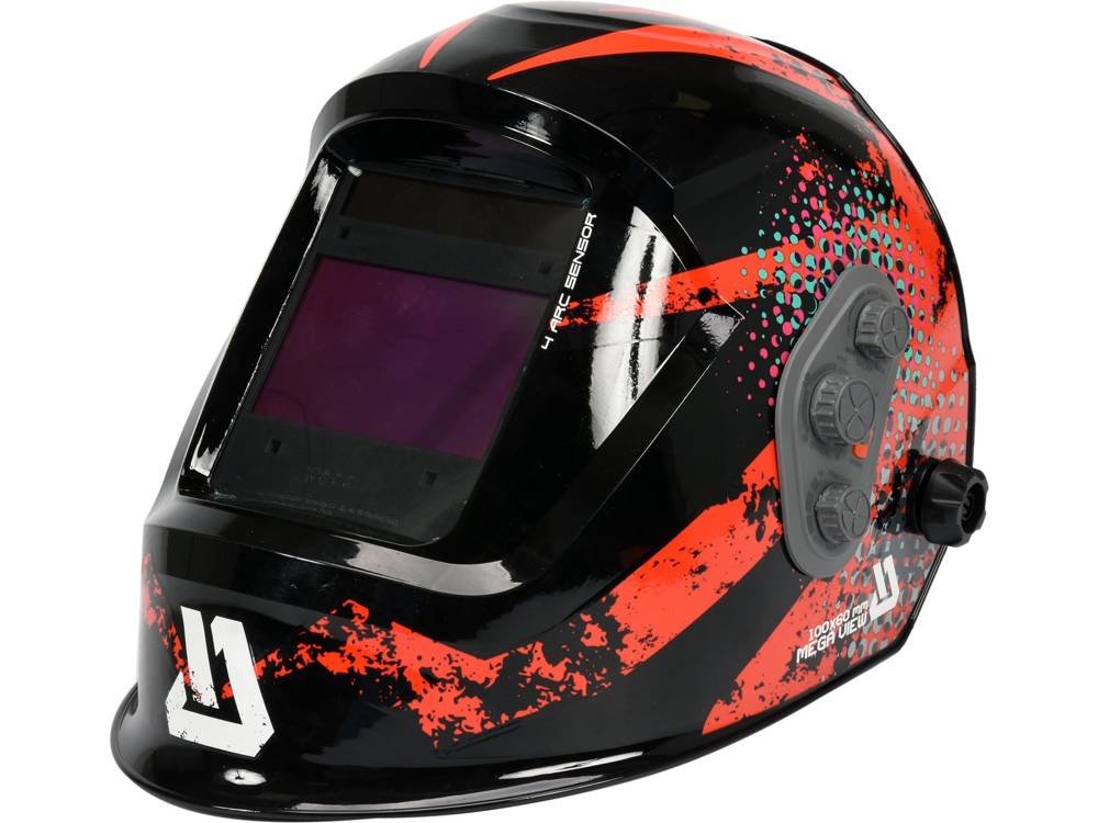 Svářečská kukla s automaticky ztmavujícím filtrem. Vysoce kvalitní filtr vybavený 4 obloukovými senzory poskytuje zorné pole 100 x 60 mm, DIN 5-9, 9-13 tmavý stav, DIN4 světelný stav, doba odezvy 1/25000 s.