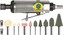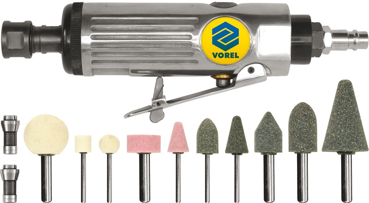 Sada pneumatické přímé brusky k připojení řezných a brusných nástrojů se stopkou průměru 6 mm.
