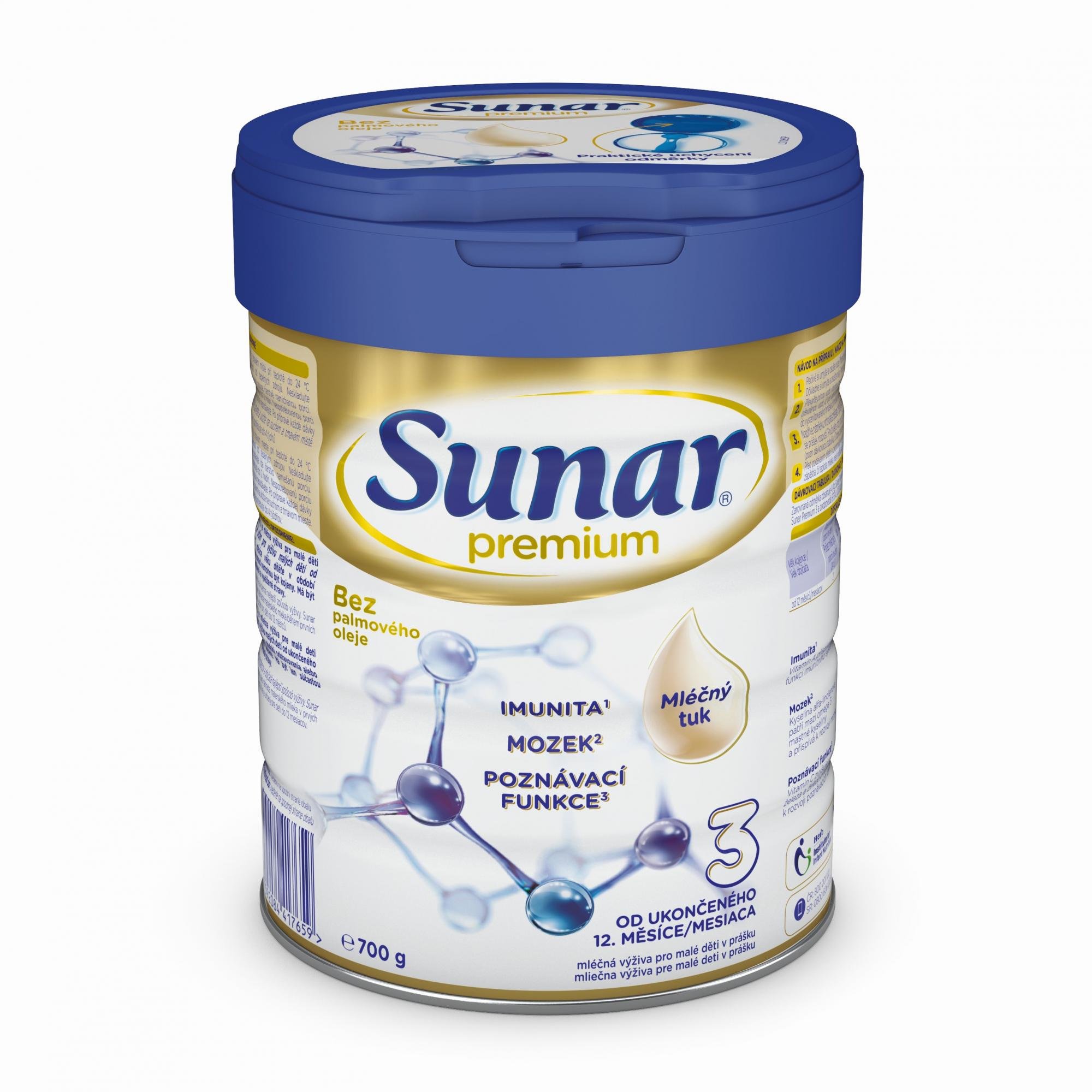 DŮLEŽITÉ UPOZORNĚNÍ! Sunar Premium 3 je mléčná výživa pro malé děti v prášku. Je určen pro výživu malých dětí od ukončeného 12. měsíce věku dítěte v období odstavování nebo pokud nemohou být kojeny. Má být pouze součástí smíšené a vyvážené stravy. Kojení je pro novorozence a kojence nejlepší způsob výživy. Sunar Premium 3 není určen jako náhrada mateřského mléka během prvních šesti měsíců života. Není určen pro děti do 12 měsíců. Upozornění: Počet mléčných dávek v jídelníčku postupně klesá se zvyšujícím se počtem nemléčných jídel. Doporučené denní dávky mléka jsou orientační, řiďte se individuální potřebou dítěte a doporučením pediatra. Při krmení neponechávejte dítě bez dozoru, hrozí riziko zalknutí. Pro zdraví kojenců malých dětí je důležité správné dodržování návodu na přípravu, používejte pouze přiloženou odměrku, neměňte poměr prášku a vody. Při nesprávném skladování a nedodržení správného návodu na přípravu může dojít k ohrožení zdraví dítěte. Po konzumaci mléka, zejména před spaním, dbejte na hygienu ústní dutiny.