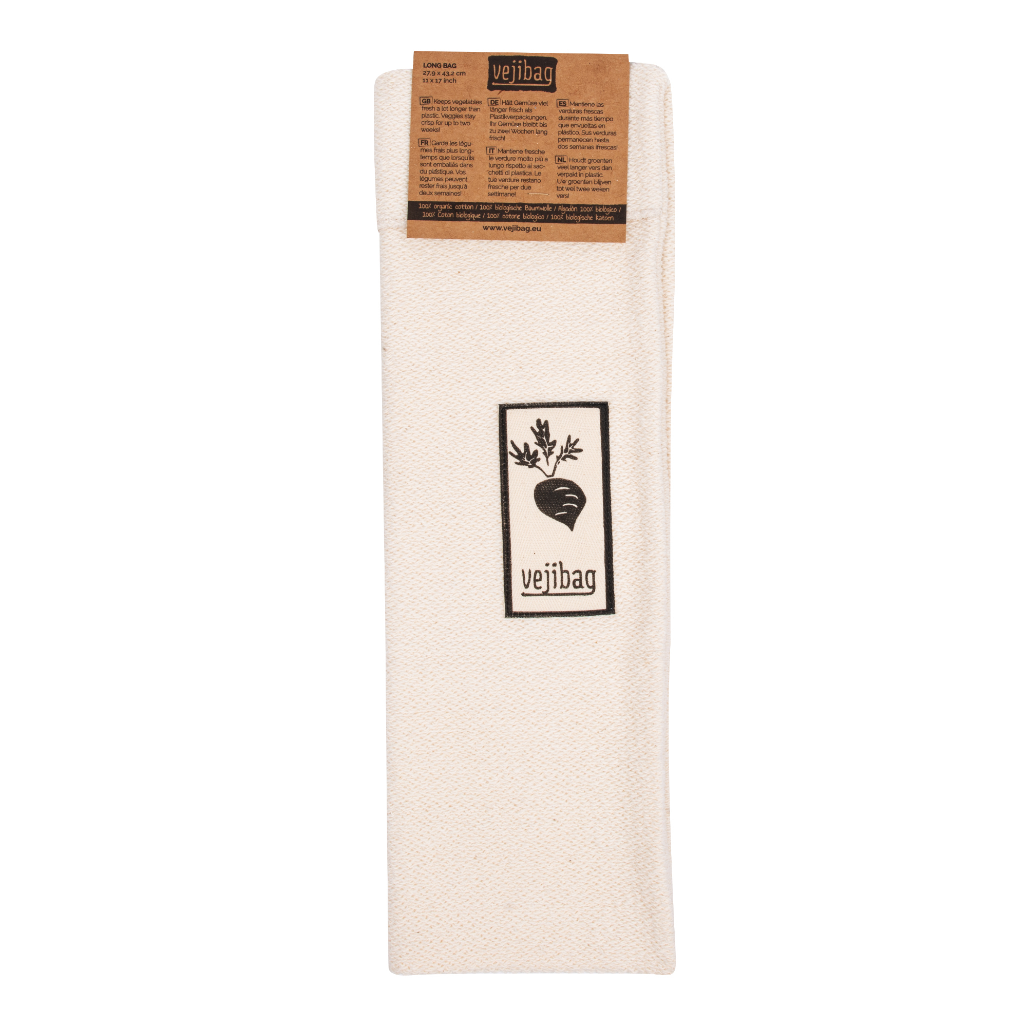 Sáček z bavlny Vejibag Long je prodyšný, umožňuje zelenině dýchat a vytváří tak ideální prostředí pro to, aby vaše zelenina zůstala co nejdéle čerstvá a křupavá. Je vyroben z ekologické bavlny. Vejibag udržuje v tkanině optimální vlhkost, která se pomalu odpařuje a zajišťuje, aby se zelenina nekazila ani nevysychala. Velikost Long je ideální například pro uložení řapíkatého celeru, pórku, okurek, cuket a další podlouhlé zeleniny.
