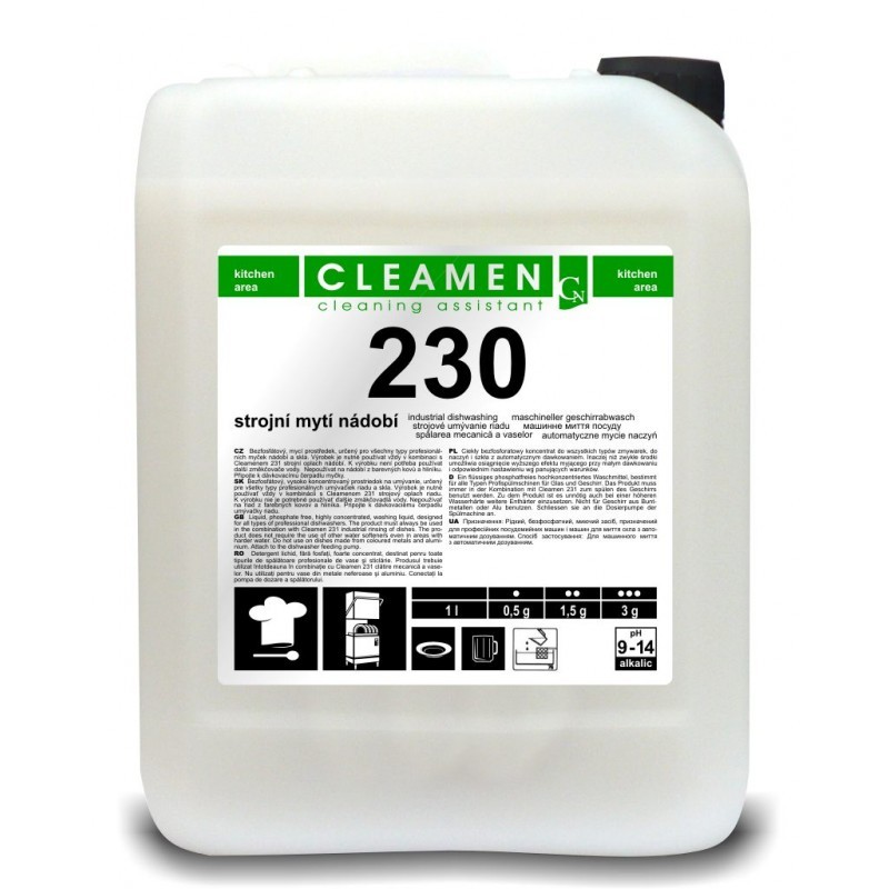 Výrobek se používá vždy v kombinaci s Cleamenem 231 strojní oplach nádobí. GHS05korozivní a žíravé látky NEBEZPEČÍ H314: Způsobuje těžké poleptání kůže a poškození očí. Bezpečnostní pokyny: Uchovávejte mimo dosah dětí. Používejte ochranné rukavice / ochranné brýle / obličejový štít. PŘI ZASAŽENÍ OČÍ: Několik minut opatrně vyplachujte vodou. Vyjměte kontaktní čočky, jsou-li nasazeny, a pokud je lze vyjmout snadno. Pokračujte ve vyplachování. PŘI STYKU S KŮŽÍ (nebo s vlasy): Veškeré kontaminované části oděvu okamžitě svlékněte. Opláchněte kůži vodou [nebo osprchujte]. PŘI POŽITÍ: Vypláchněte ústa. NEVYVOLÁVEJTE zvracení. Obsah / nádobu likvidujte v souladu s národními předpisy. Bezpečnostní list