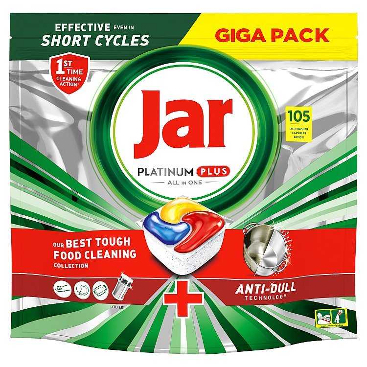Kapsle Jar Platinum Plus Lemon do automatické myčky nádobí zanechávají nádobí čisté jako nové, zaručují nejlepší čisticí účinky Jaru a dokonce pomáhají odstraňovat zašedlost vznikající časem a obnovují původní lesk nádobí. Kapsle Jar Platinum Plus mají zabudovaný systém předmývání, takže nádobí nemusíte předmývat sami. S kapslemi nebudete muset nádobí předmývat, ušetříte více vody a budete šetrnější k životnímu prostředí. Jar spojuje v jedné účinné kapsli tekutý i práškový prostředek na mytí nádobí. Vysoce rozpustný obal se rychle rozpouští a funguje dobře i při krátkých cyklech, takže nádobí se začíná ihned umývat. A navíc se kapsle tak snadno používají. Kapsli není třeba rozbalovat a stačí ji jen vložit do dávkovacího zásobníku na mycí prostředek.
