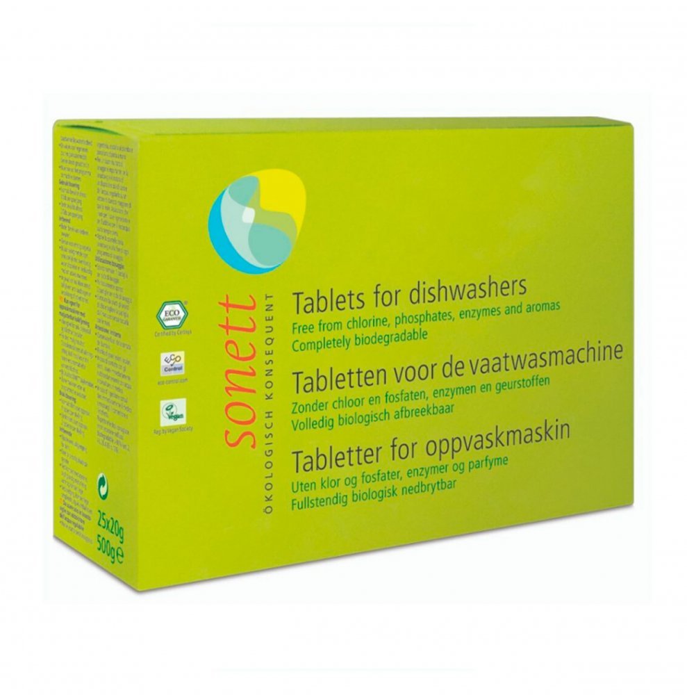 SONETT Tablety do myčky (25 ks) 500 gÚčinný prostředek do myčky na nádobí. Speciální složení efektivně odstraní mastné skvrny a zbytky jídla.Dávkování: 1 tableta - 20g na jeden cyklus. Při velkém znečištění zvyšte na 2 tablety na cyklus.Tablety SONETT obsahují nerostné látky a biologicky plně odbouratelné organické složky. Neobsahují enzymy, agresivní bělicí látky s obsahem chloru, fosfáty ani vonné látky.Uchovejte v suchu a v uzavřeném obalu. Skladujte mimo dosah dětí. Při náhodném požití vyhledejte lékaře a předložte tento obal.