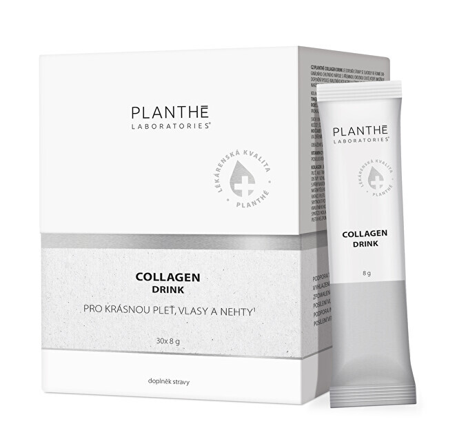 PLANTHÉ Collagen drink je doplněk stravy se sladidly ve formě originálního chutného nápoje s příjemnou ovocnou chutí, který umožňuje doplnění vysoce kvalitního kolagenu a stimulaci jeho tvorby, která se s narůstajícím věkem zpomaluje.Kolagen je doplněn COLLAGEN+ komplexem 8 účinných látek - zinkem, biotinem, vitaminem C, vitaminem B5, extrakty višně, Aloe vera s fytosteroly, zeleného čaje a regeneračním faktorem VITAE® z chlorelly, které prokazatelně regenerují, projasňují a omlazují pleť.Kolagen je vnímán jako stavební kámen nejen pro zdravou a pružnou pleť, ale také pro klouby a šlachy. Tento protein je zodpovědný za mladistvý vzhled pleti, za udržení struktury, pevnosti a elasticity kůže. S přibývajícím věkem však hladina kolagenu a schopnost jeho biosyntézy v našem těle klesá, což vede k výskytu vrásek, ztrátě elasticity, svěžesti i hydratace pleti.Právě doplňování kolagenu zevnitř může tělu a pokožce poskytnout potřebné stavební prvky pro tvorbu kolagenu. Pravidelné užívání kvalitního kolagenu s dalšími aktivními složkami, které navíc stimulují biosyntézu kolagenu, pak může vést k hladší, zdravější a celkově mladistvější pleti a ke zpomalení procesu stárnutí pokožky i lepší kvalitě vlasů a nehtů.