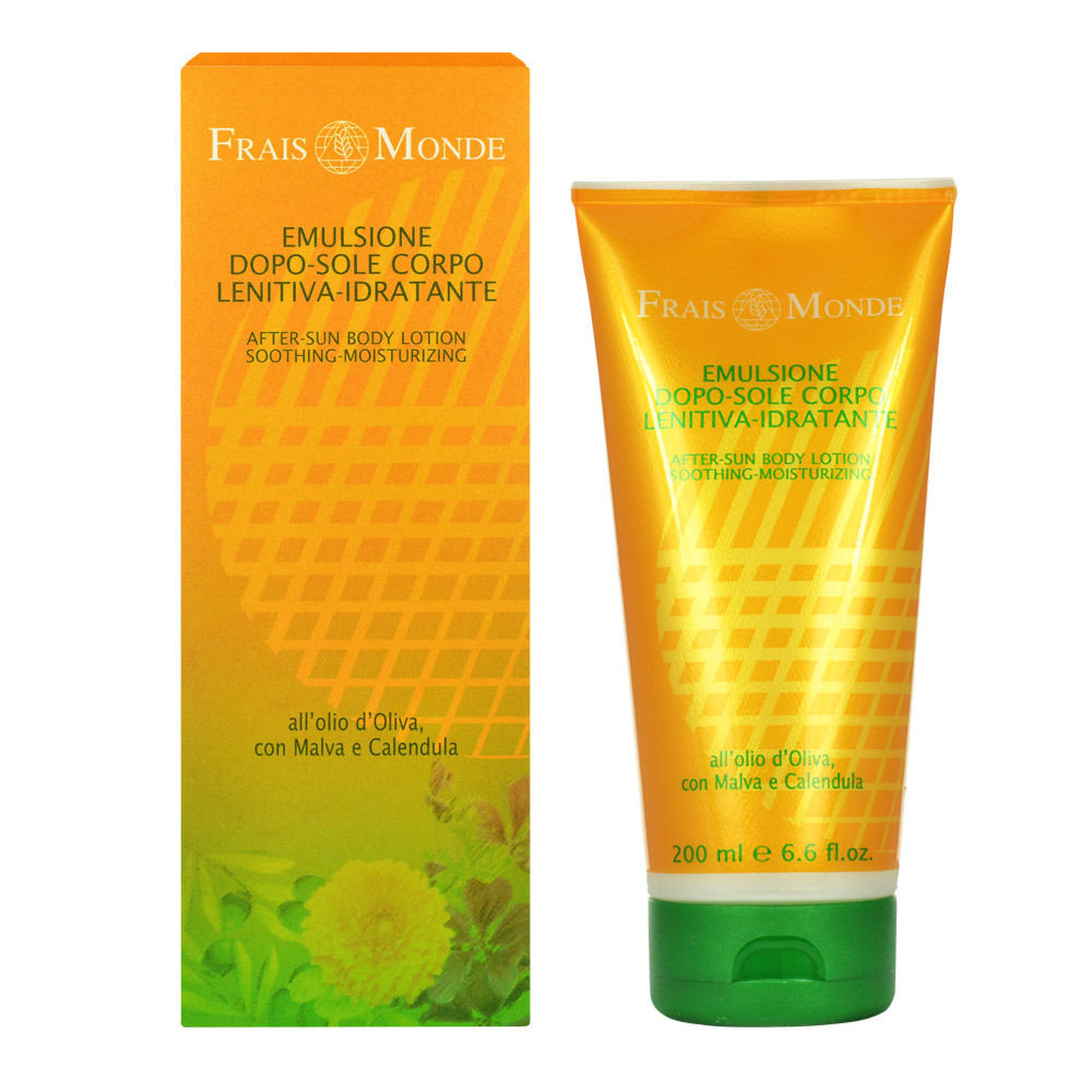 Mléko po opalování **Frais Monde After-Sun Body Lotion Soothing-Moisturizing**. Lehké mléko po opalování Frais Monde After-Sun Body Lotion Soothing-Moisturizing zklidňuje pokožku a dodává jí potřebnou hydrataci. Díky obsaženému měsíčku a slézu je pokožka jemná a hydratovaná. **Obsahuje**: kyselina glykolová (2:1) sléz, kyselina glykolová (2:1) měsíčkový extrakt, olivový olej, jojobový olej, máslo karité, mandlový olej, hydratační faktor **Použití**: Aplikujte na suchou pokožku po opalování.