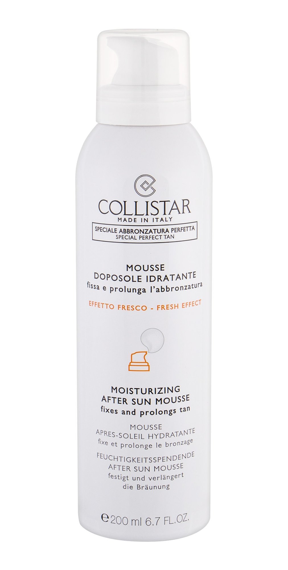 Pěna **Collistar Special Perfect Tan After Sun Mousse** zklidní vaši pokožku po opalování a dodá ji potřebnou regeneraci. ### Pečujte o svou pokožku i po opalování! * prodlužuje opálení, * dodá pocit svěžesti. ### Aplikujte pěnu Collistar po opalování správným způsobem! Důkladně protřepejte. Naneste rovnoměrně na čistou pokožku a nechte vstřebat.