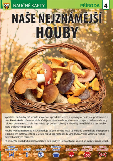 Naše nejznámější houby - Naučné karty jsou praktický a přenosný průvodce pro všechny milovníky přírody a houbaření. Tyto karty vám pomohou snadno identifikovat 28 nejznámějších druhů hub, a to kdykoliv a kdekoliv vás vaše dobrodružství zavede.