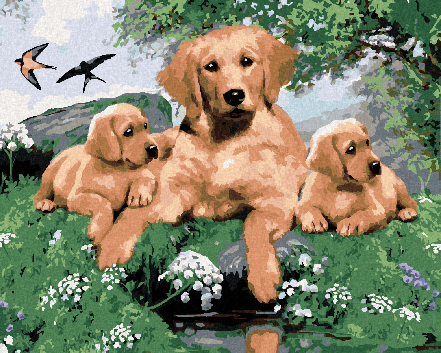 Malování podle čísel - ZLATÝ RETRÍVR A ŠTĚŇATA (HOWARD ROBINSON) - 40x50 cm, vypnuté plátno na rám