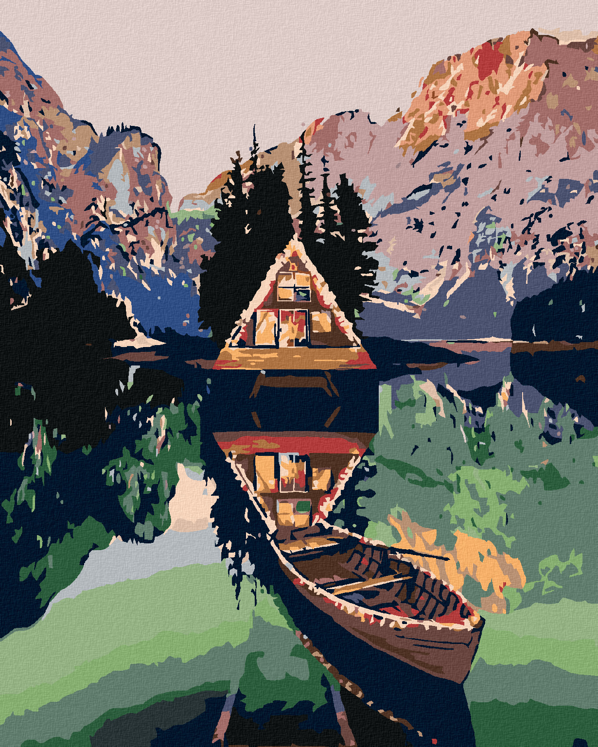 Malování podle čísel - PRAMICE U CHATKY NA JEZEŘE V HORÁCH - 40x50 cm, vypnuté plátno na rám
