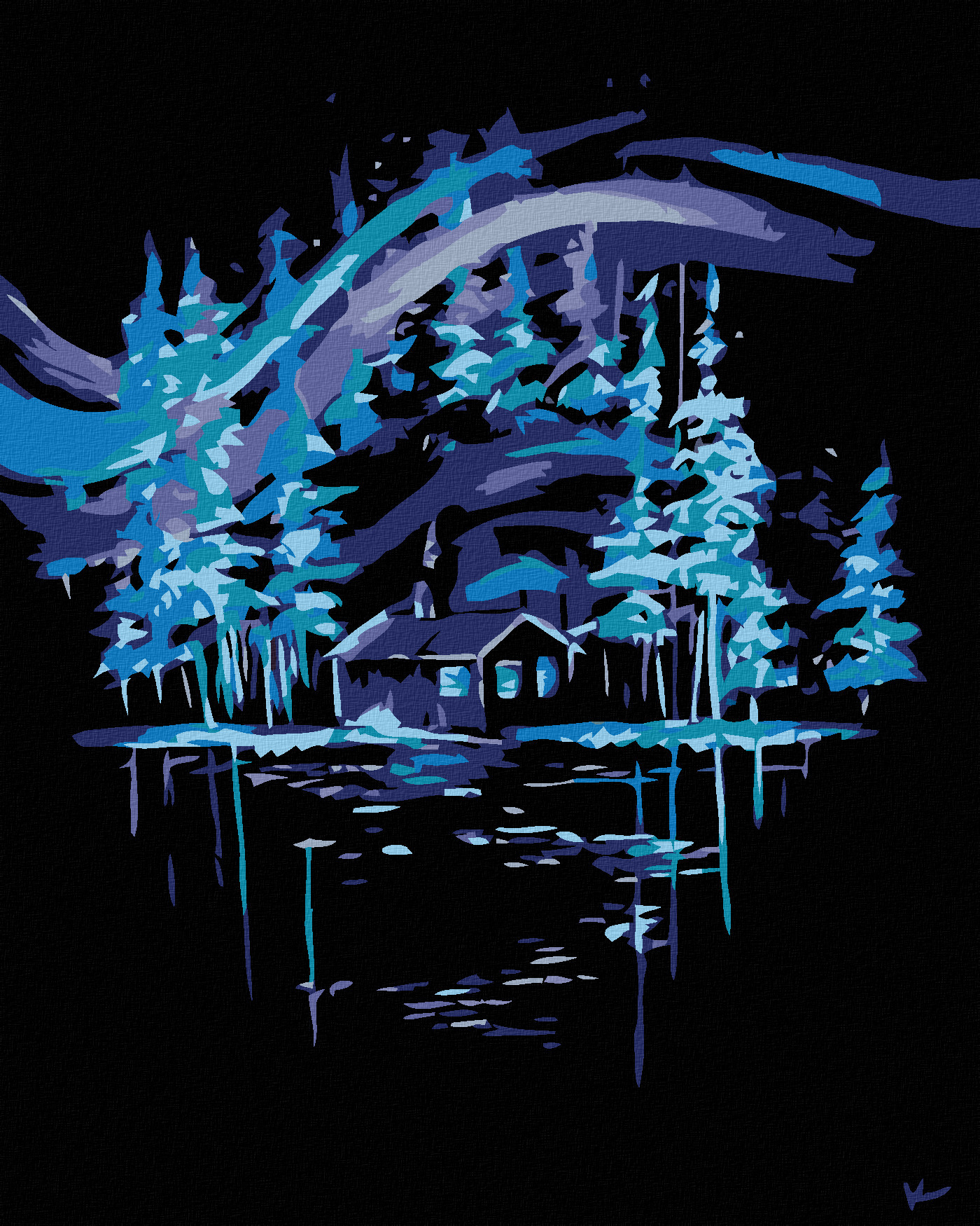 Malování podle čísel - POLÁRNÍ ZÁŘE NAD CHALOUPKOU - 40x50 cm, vypnuté plátno na rám