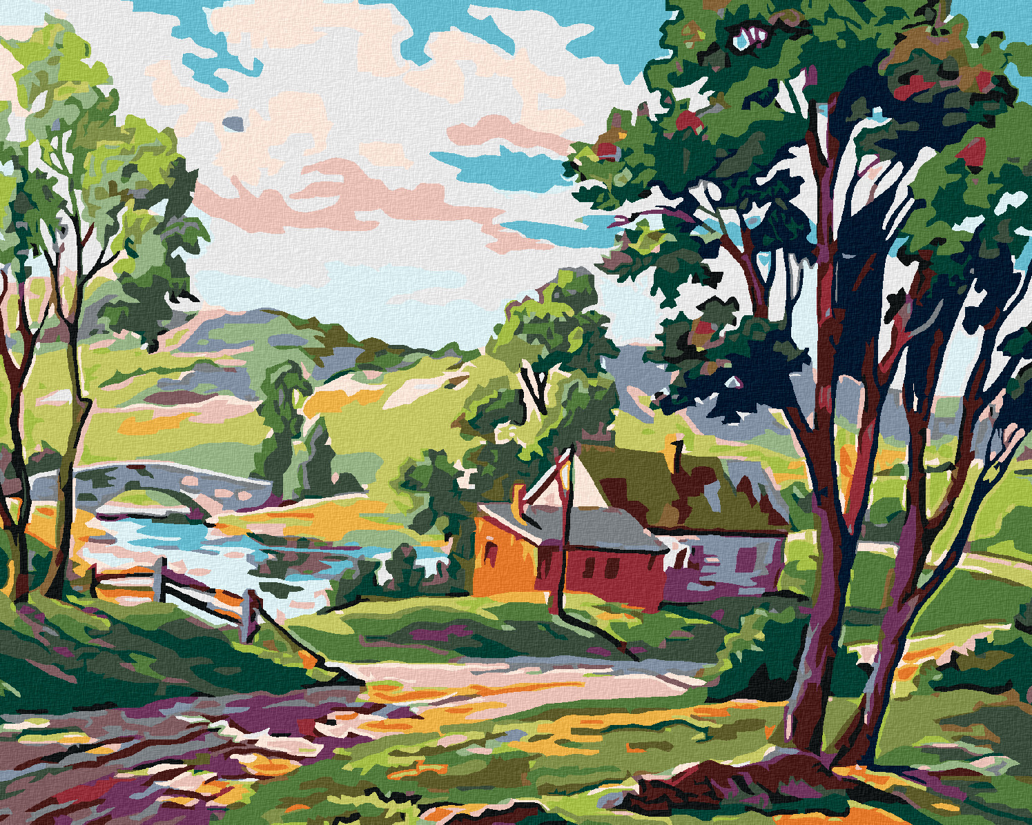 Malování podle čísel - VENKOVSKÉ STAVENÍ U RYBNÍČKU - 40x50 cm, vypnuté plátno na rám
