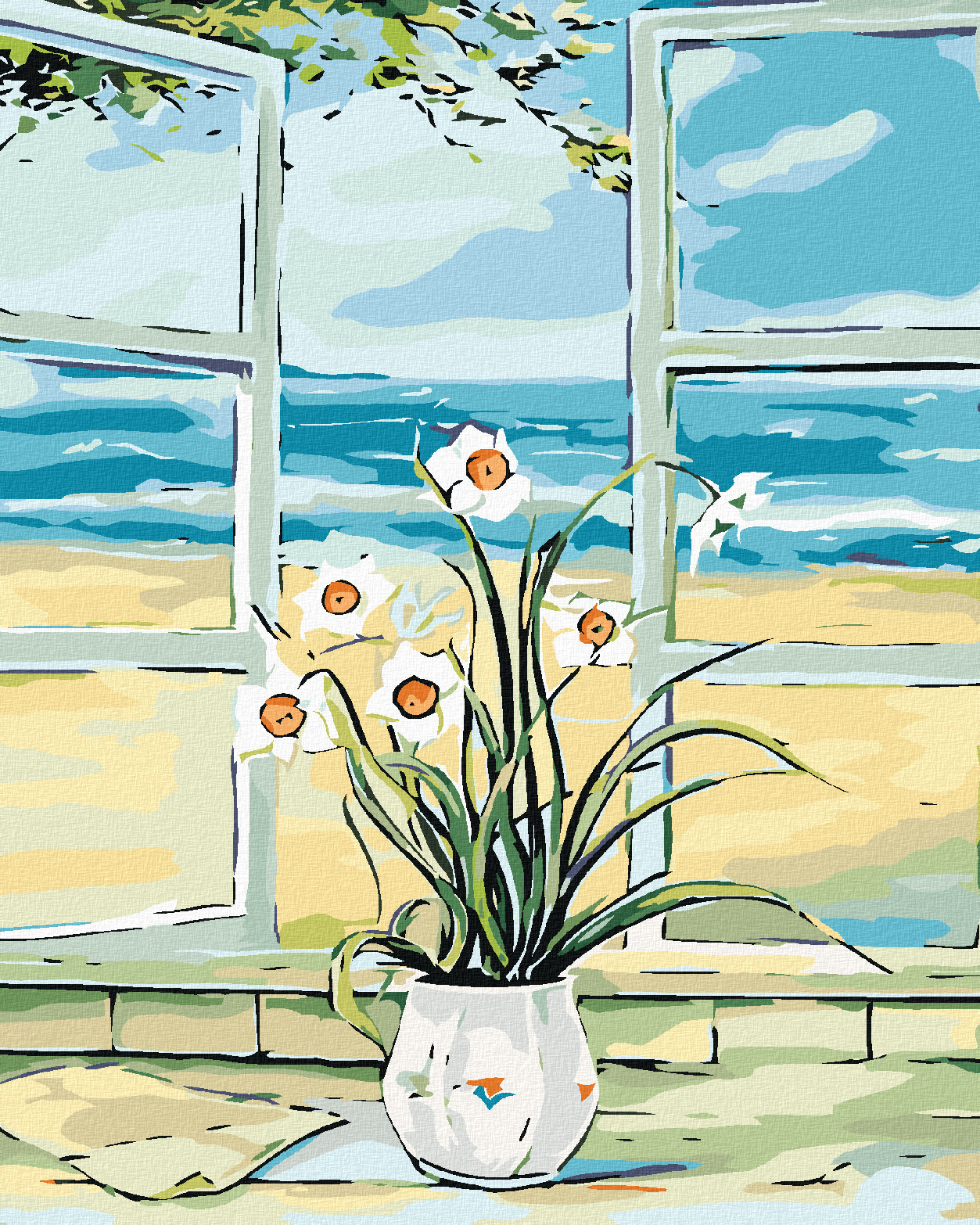 Malování podle čísel - NARCIS V OKNĚ U PLÁŽE - 40x50 cm, bez rámu a bez vypnutí plátna