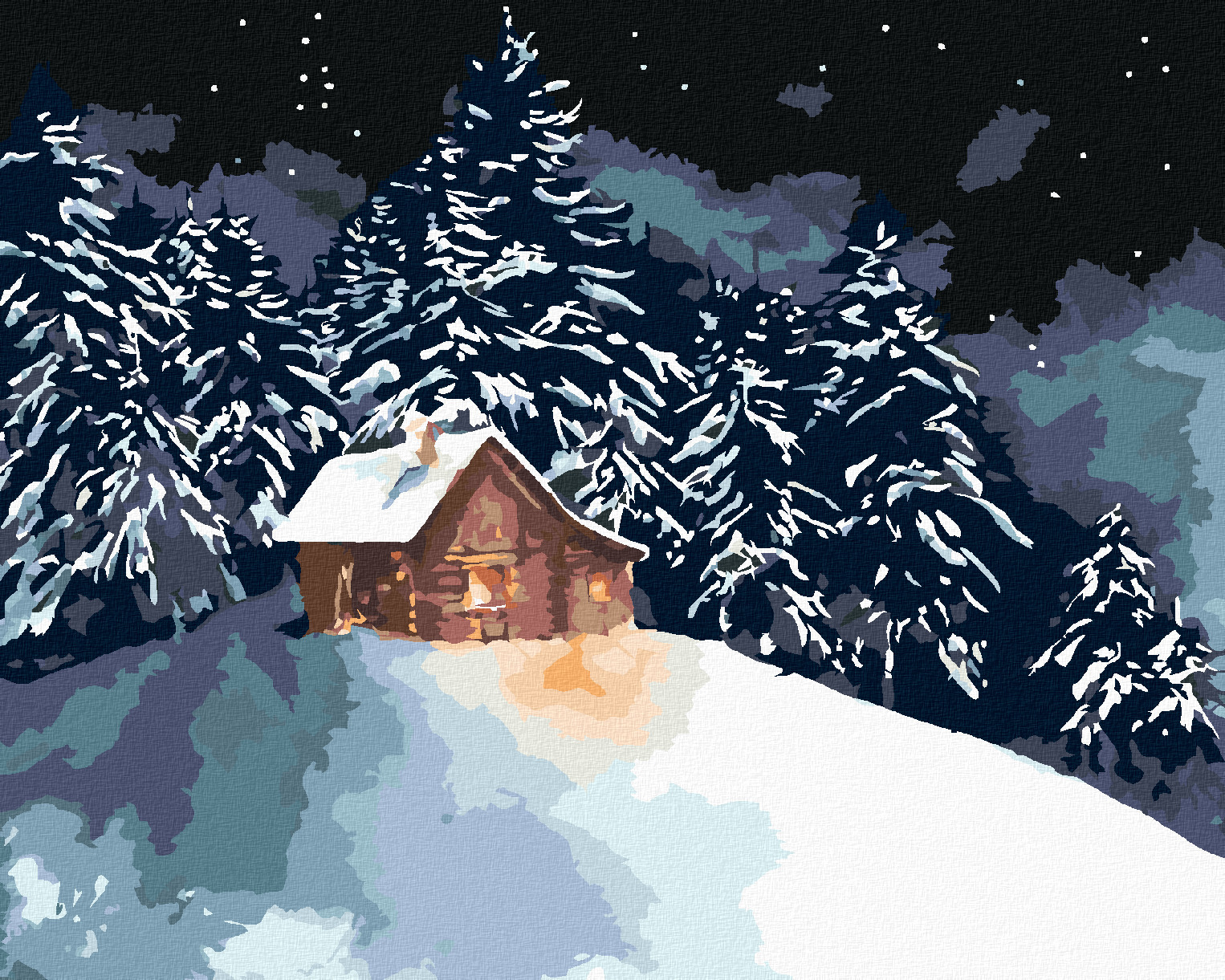 Malování podle čísel - LESNÍ SRUB NA ZASNĚŽENÉM KOPEČKU - 40x50 cm, vypnuté plátno na rám