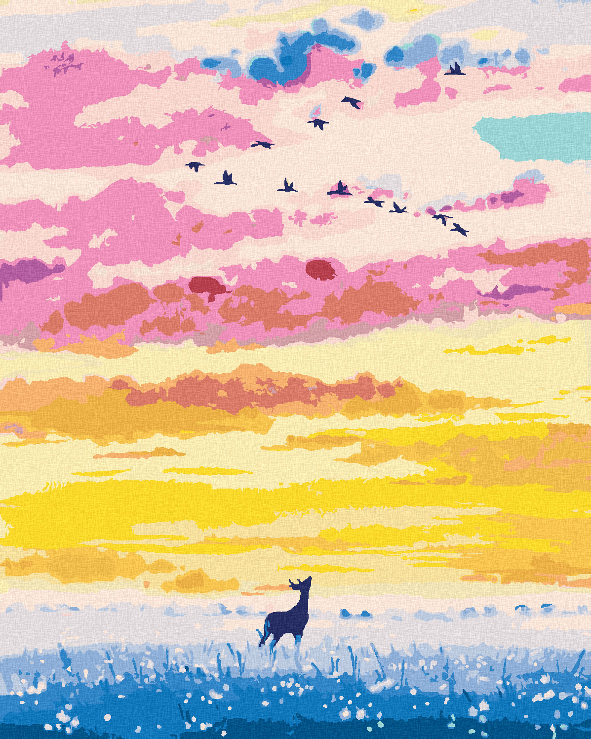 Malování podle čísel - JELEN V DIVOKÉM POLI SE SOUMRAKEM - 40x50 cm, vypnuté plátno na rám
