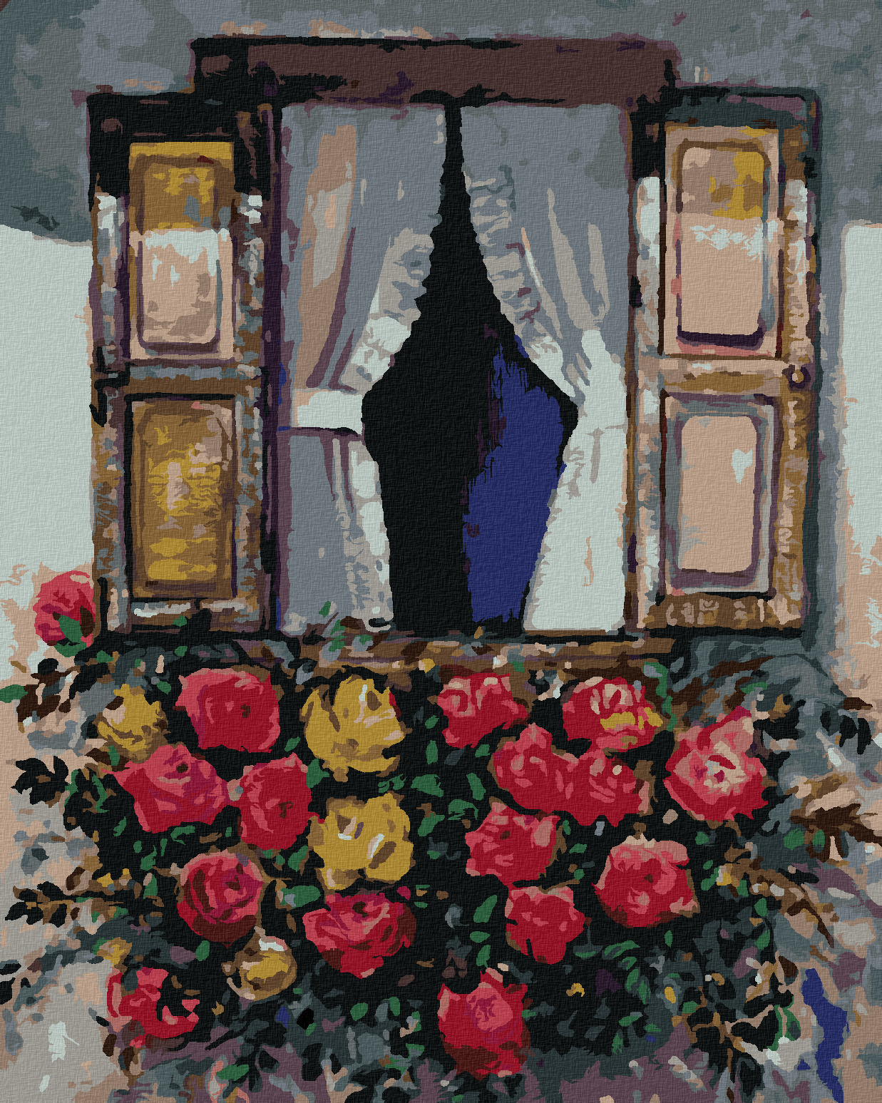 Malování podle čísel - OKNO S ROZKVETLÝMI KVĚTINAMI - 40x50 cm, bez rámu a bez vypnutí plátna