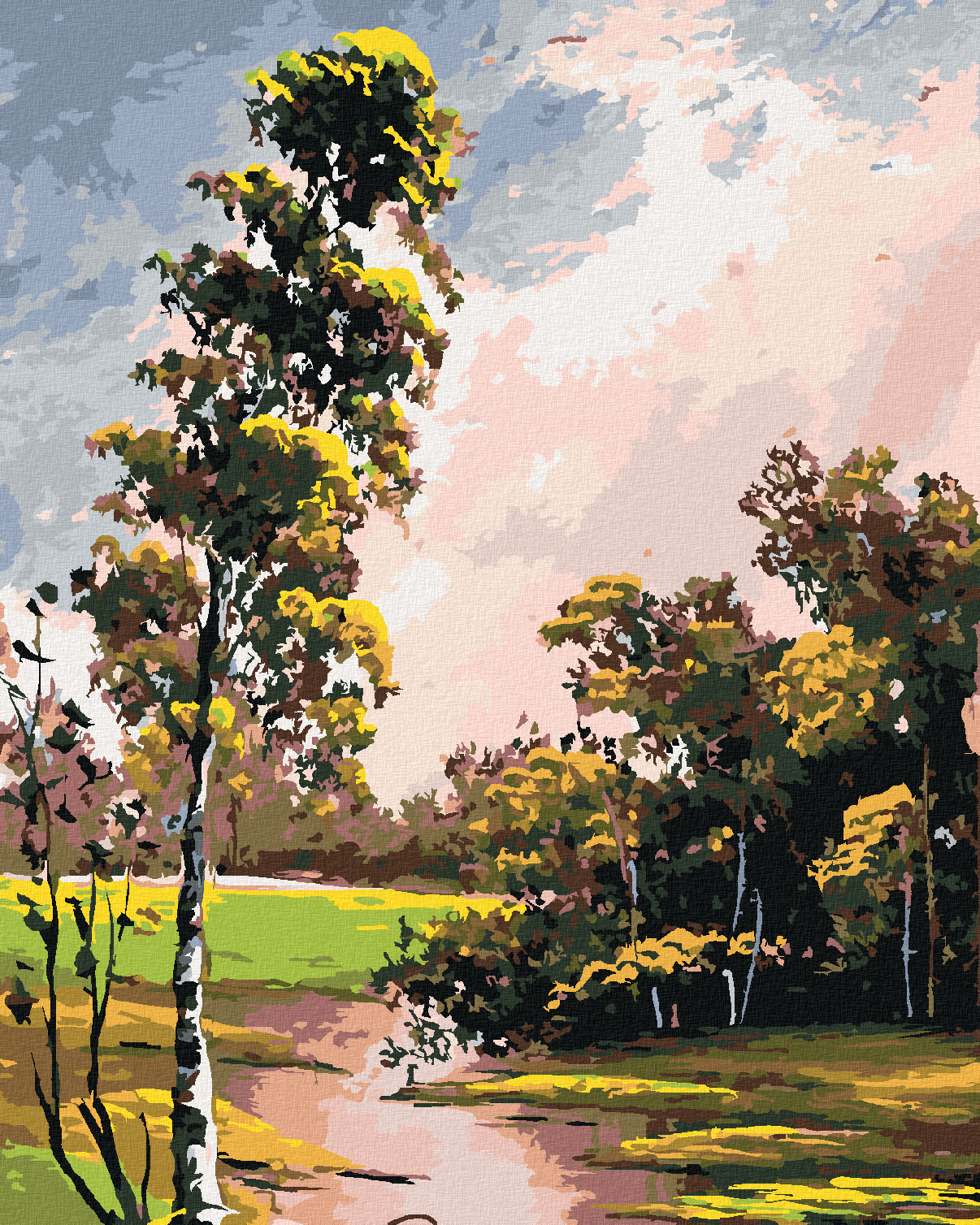 Malování podle čísel - LETNÍ KRAJINA S BŘÍZOU A JEZÍRKEM - 40x50 cm, bez rámu a bez vypnutí plátna
