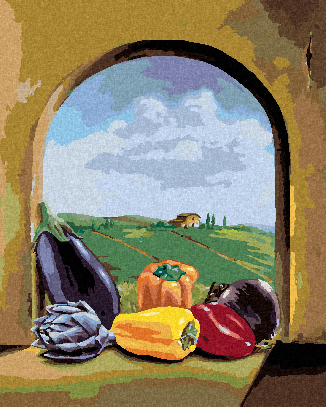 Malování podle čísel - MIX ZELENINY NA OKNĚ S VÝHLEDEM NA KRAJINU - 40x50 cm, vypnuté plátno na rám