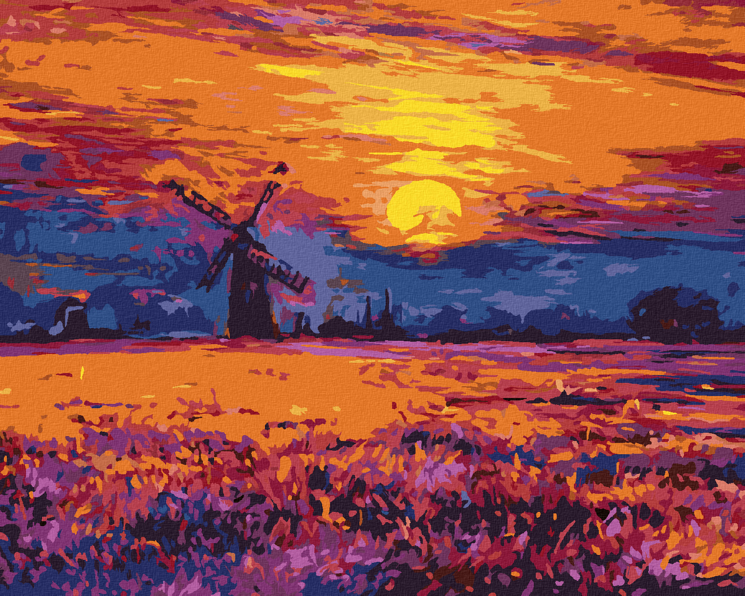 Malování podle čísel - BAREVNÝ ZÁPAD SLUNCE A VĚTRNÝ MLÝN - 40x50 cm, bez rámu a bez vypnutí plátna
