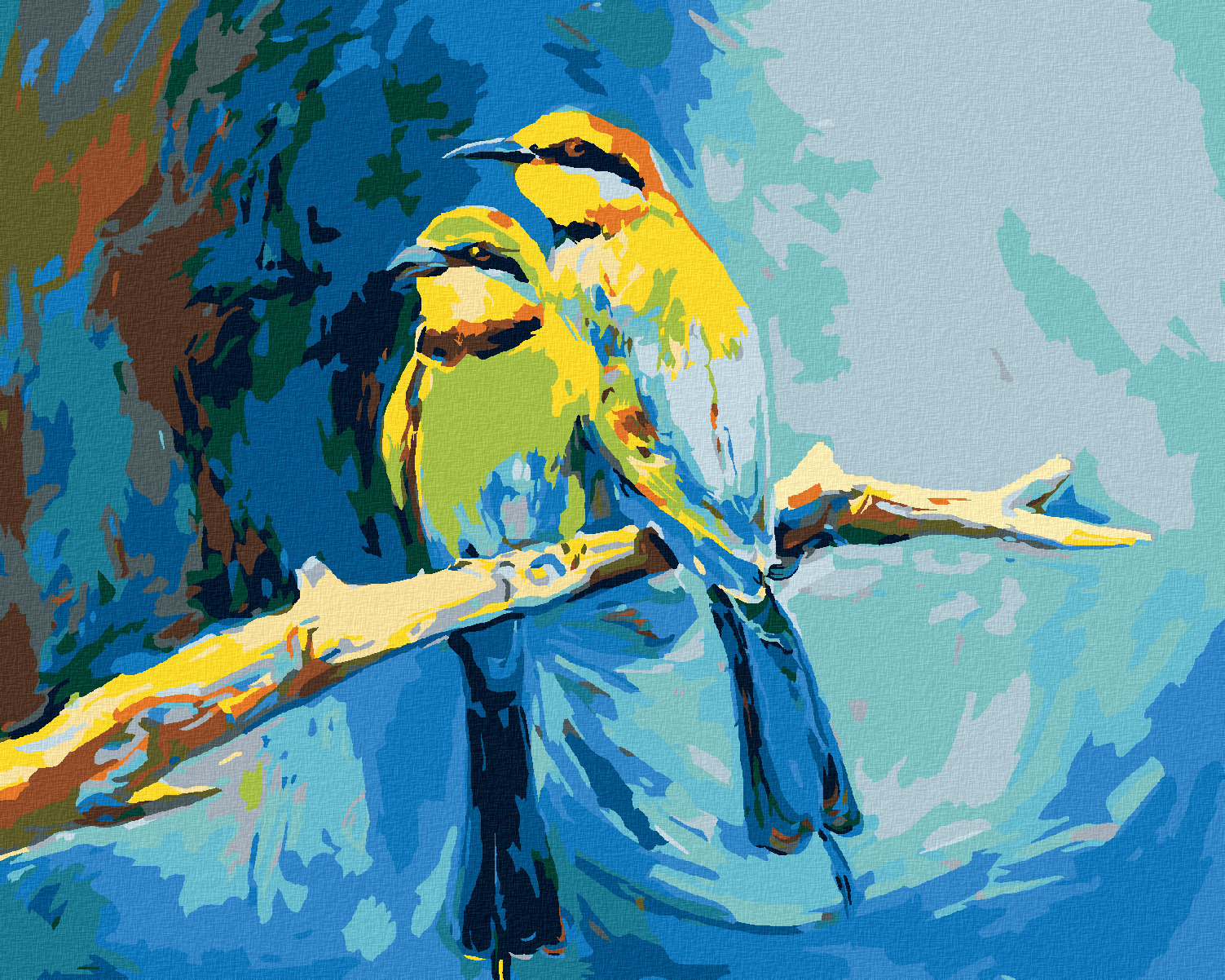 Malování podle čísel - BAREVNÍ PTÁČCI NA MODRÉM POZADÍ - 40x50 cm, vypnuté plátno na rám