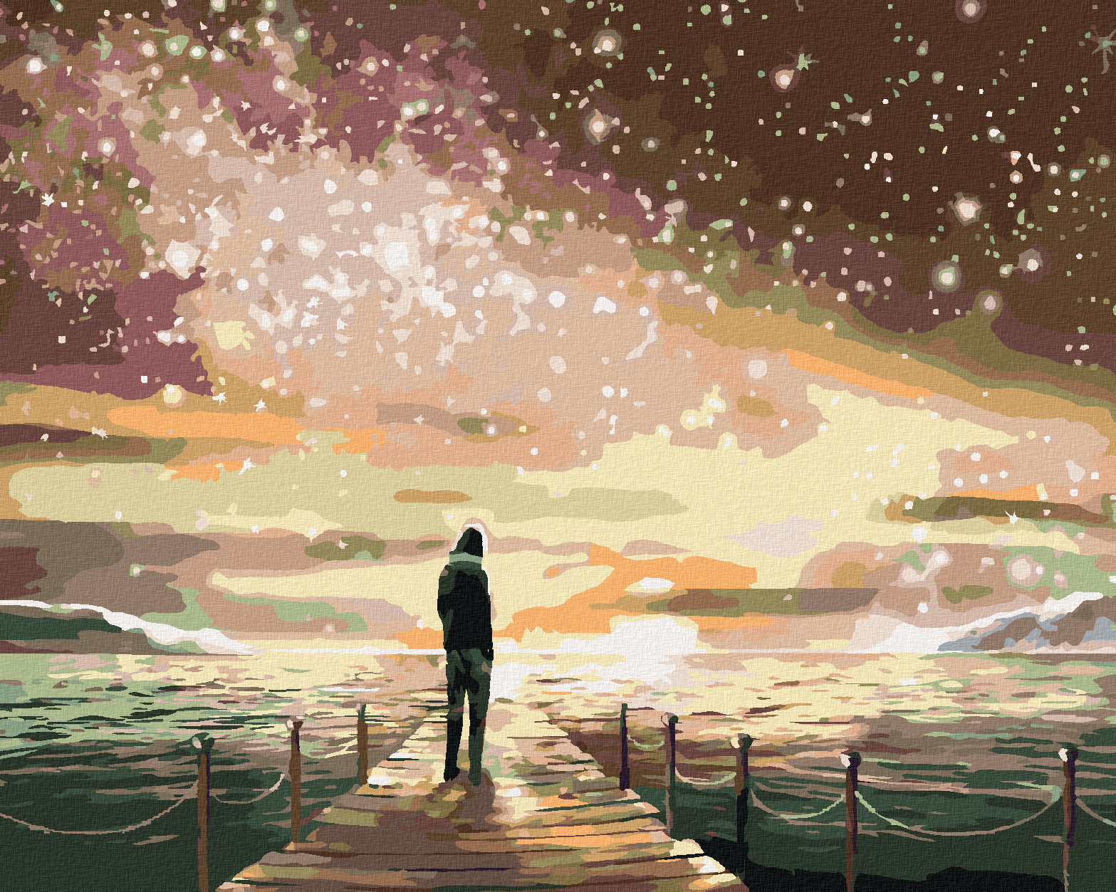 Malování podle čísel - MUŽ NA MOLU POD ZÁŘÍCÍ OBLOHOU - 80x100 cm, bez rámu a bez vypnutí plátna